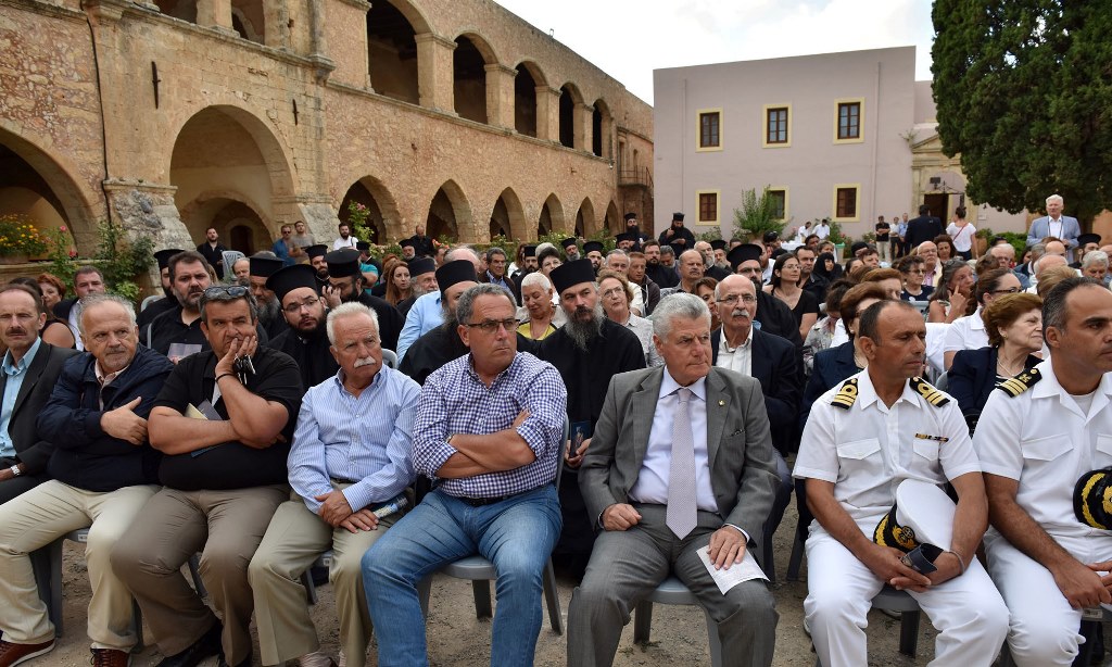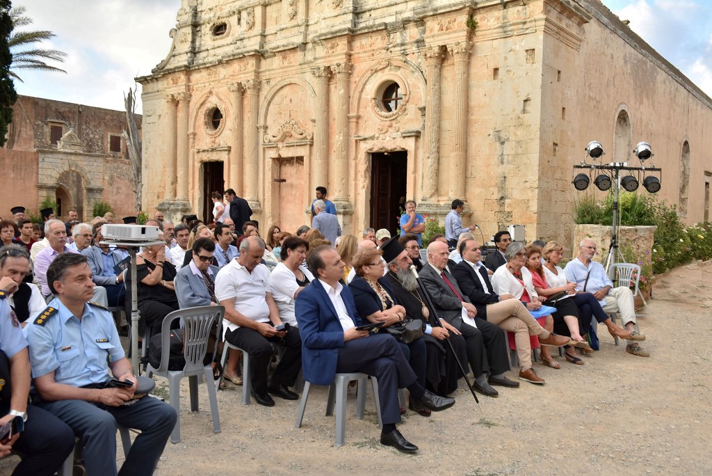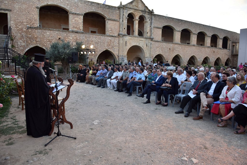 Η εκδήλωση του εγκαινισμού της Πινακοθήκης, την οποία συντόνισε ο κ. Μάνος Παντελιδάκης, Γραμματέας της Ιεράς Μονής Αρκαδίου, πραγματοποιήθηκε στον αύλειο χώρο του Μοναστηριού. Στην έναρξή της απηύθυνε χαιρετισμό ο κ. Γεώργιος Μαρινάκης, Δήμαρχος Ρεθύμνης, ο οποίος εξήρε την πνευματική και πολιτιστική πρόοδο και ανάπτυξη του Αρκαδίου, που συντελείται κατά τα τελευταία έτη με την φροντίδα της Τοπικής μας Εκκλησίας. Ακολούθως τον λόγο έλαβε η κ. Μαρία Μαραγκού, Καλλιτεχνική Διευθύντρια του Μουσείου Σύγχρονης Τέχνης Κρήτης, η οποία αναφέρθηκε στο ιστορικό της παραχώρησης των έργων της Πόπης Παυλάκη από το Μουσείο προς την Ιερά Μονή και εξέφρασε την χαρά της που πλέον αυτά θα φιλοξενούνται στον φυσικό τους χώρο, στον οποίο άλλωστε τα εμπνεύσθηκε και τα δημιούργησε η αοίδιμος ζωγράφος.