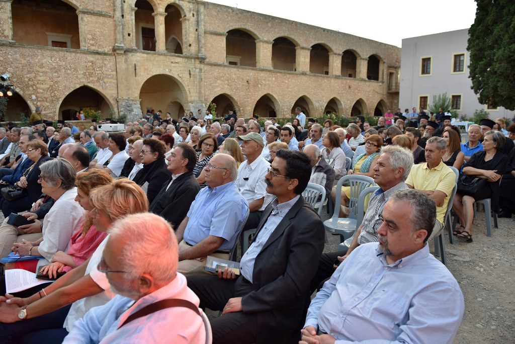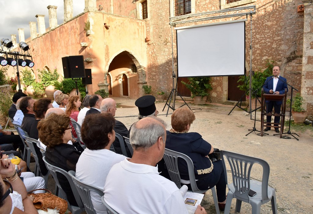 Η εκδήλωση του εγκαινισμού της Πινακοθήκης, την οποία συντόνισε ο κ. Μάνος Παντελιδάκης, Γραμματέας της Ιεράς Μονής Αρκαδίου, πραγματοποιήθηκε στον αύλειο χώρο του Μοναστηριού. Στην έναρξή της απηύθυνε χαιρετισμό ο κ. Γεώργιος Μαρινάκης, Δήμαρχος Ρεθύμνης, ο οποίος εξήρε την πνευματική και πολιτιστική πρόοδο και ανάπτυξη του Αρκαδίου, που συντελείται κατά τα τελευταία έτη με την φροντίδα της Τοπικής μας Εκκλησίας. Ακολούθως τον λόγο έλαβε η κ. Μαρία Μαραγκού, Καλλιτεχνική Διευθύντρια του Μουσείου Σύγχρονης Τέχνης Κρήτης, η οποία αναφέρθηκε στο ιστορικό της παραχώρησης των έργων της Πόπης Παυλάκη από το Μουσείο προς την Ιερά Μονή και εξέφρασε την χαρά της που πλέον αυτά θα φιλοξενούνται στον φυσικό τους χώρο, στον οποίο άλλωστε τα εμπνεύσθηκε και τα δημιούργησε η αοίδιμος ζωγράφος.